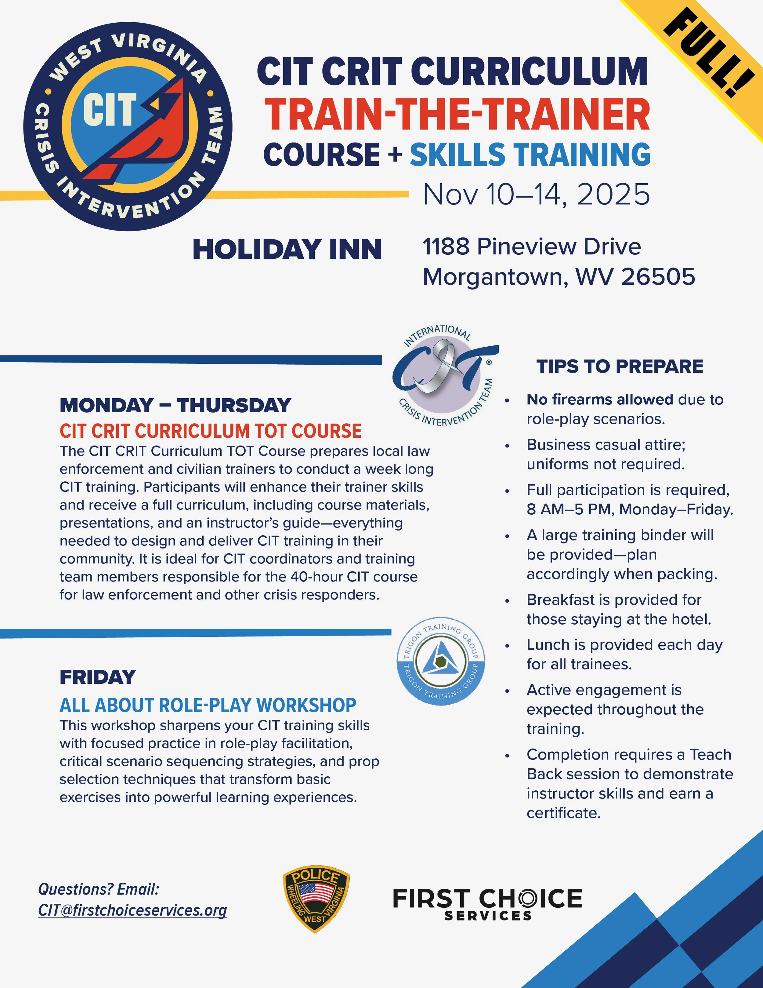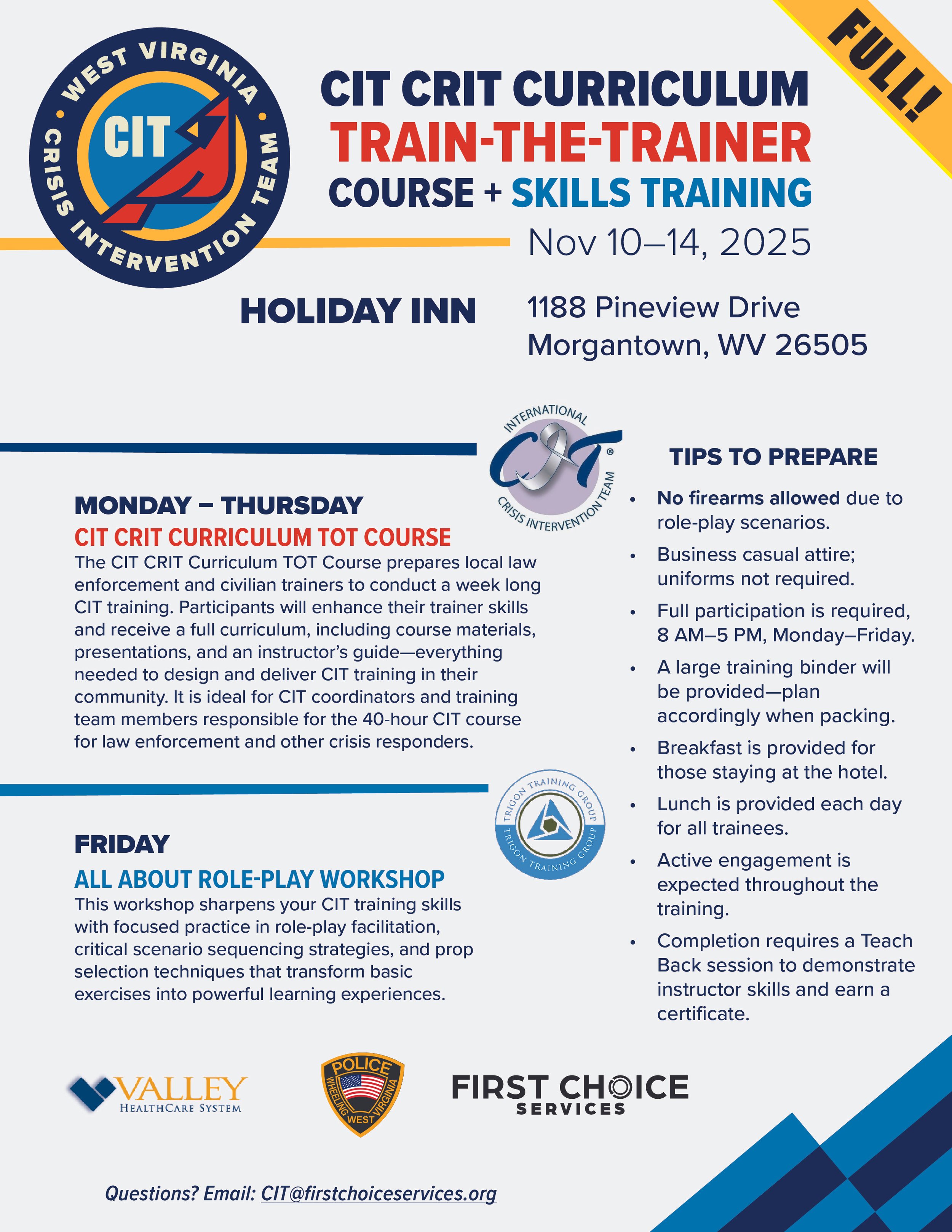 CIT Training for Trainers Monday, November 10, 2025 8:00 AM Friday, November 14, 2025 5:00 PM Holiday Inn 1188 Pineview Drive Morgantown, WV, 26505 (map) Google Calendar ICS